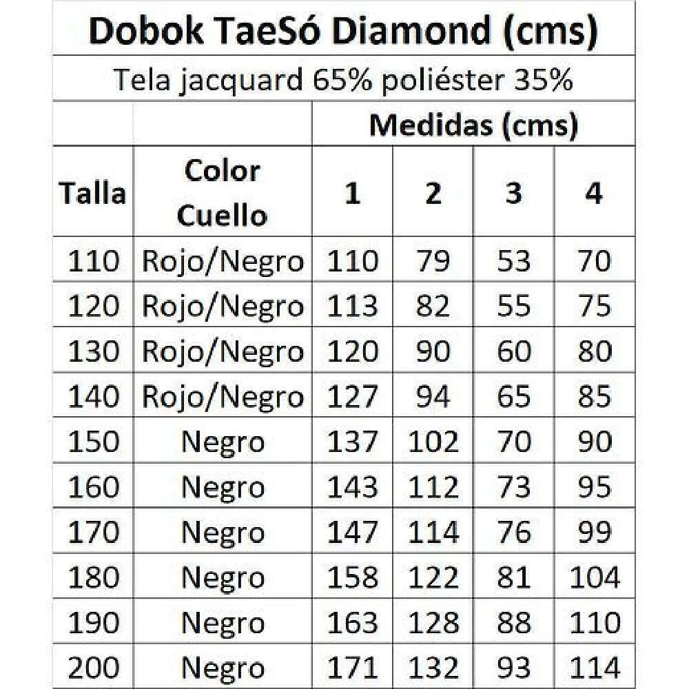 Dobok Taekwondo TaeSó Diamond Tela jacquard diamond 65% poliéster 35% algodón, ultra resistente. Pantalón elasticado. Viene con cinturón blanco de regalo. Cuello Rojo Negro